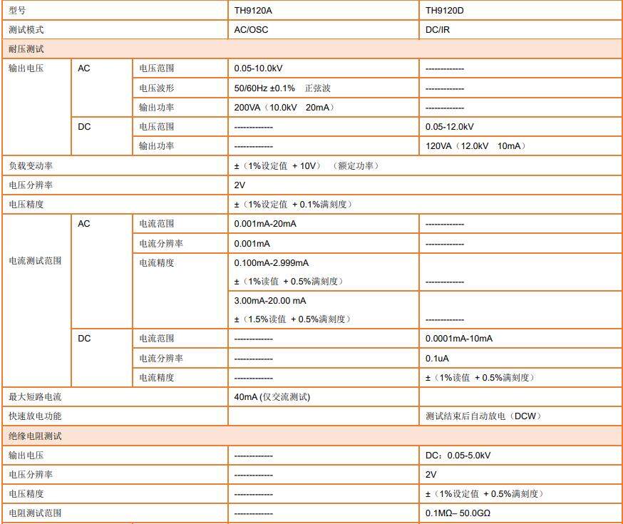 TH9120A/TH9120D 交/直流耐壓絕緣電阻測試儀是針對高壓光耦合器及高壓繼電器、高壓開關、PV模組等絕緣耐受力較高的器件提供高壓的耐壓測試與分析。在耐壓測試方面,輸出功率AC:200VA(10kV、20mA),DC:120VA(12kV、 10mA),因此可用來為高耐壓的定子、電機等設備做耐壓測試,也可以對零件做同樣的測試。在絕緣電阻測試方面,所能顯示范圍為 0.1MΩ~50GΩ,測試電壓為 50V~5000V 可任意設定。在開短路檢測測試方面,進行高壓測試前,先判斷被測件是否可靠連接,再進行高壓測試。在顯示方面,所有的測試模式、時間、電壓、電流、電阻值、測試步驟等都在顯示器上顯示,另有列表顯示模式,顯示多步驟的設置及順序測試結(jié)果。儀器標HANDLER(機械手接口)、RS-232、LAN、USB DEVICE、USB HOST;選配GPIB接口,無論是連接上位機、PLC、自動化系統(tǒng)都得心應手。一件截屏、一鍵記錄功能方便將測試結(jié)果保存至U盤可定制上位機軟件,操作更靈活,記錄更方便。