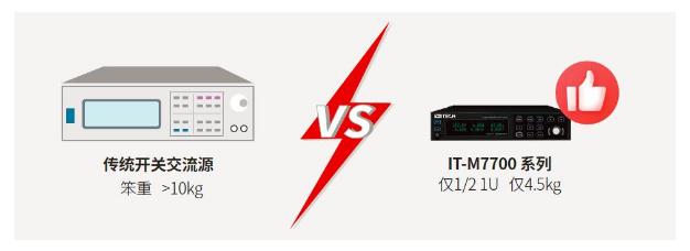 傳統(tǒng)交流電源通常體積較大,重量較重,不能輕易搬動(dòng)。IT-M7700系列僅? 1U的體積內(nèi)功率可達(dá)600VA,重量也僅有4.5kg,不到市面上同類型產(chǎn)品的一半。如此高功率密度的設(shè)計(jì),不但增加了空間利用率,同樣適用于便攜及桌面測(cè)試,也是系統(tǒng)搭建的良好選擇。