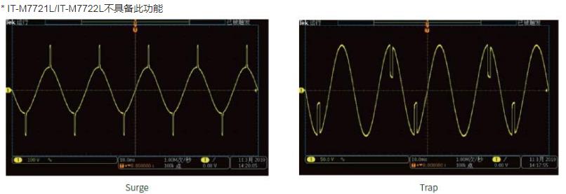 IT-M7700系列提供突波/陷波的模擬功能,用戶可以根據(jù)需求在輸出正弦波的基礎(chǔ)上加上突波/陷波來(lái)模擬電路系統(tǒng)中電壓的異常波動(dòng),從而測(cè)試待測(cè)物在此種環(huán)境下的使用情況。