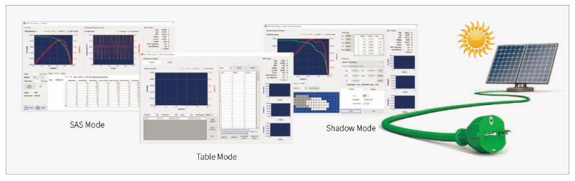 IT6000C系列選配SAS1000太陽能電池矩陣仿真軟件,可仿真太陽電池矩陣的I-V 曲線,內(nèi)建EN50530、Sandia、NB/T32004、CGC/GF004、CGC/GF035的SAS 模型,用戶簡(jiǎn)單設(shè)定參數(shù)后,即可模擬I-V曲線輸出并生成報(bào)表,用于測(cè)試光伏逆變器的靜態(tài)和動(dòng)態(tài)最大功率追蹤效能。用戶還可以編輯任何屏蔽可達(dá)4096個(gè)點(diǎn)的I-V曲線實(shí)現(xiàn)動(dòng)態(tài)云遮效果,或存儲(chǔ)100條不同光照、溫度下的I-V曲線于內(nèi)存,并設(shè)定每條曲線執(zhí)行時(shí)間及執(zhí)行順序,以此來測(cè)試光伏逆變器在不同氣候條件下的長(zhǎng)時(shí)間最大功率追蹤效能。