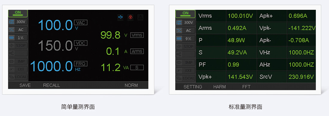 高性能可編程交流電源集成功率計,可實(shí)現(xiàn)電氣參數(shù)的精準(zhǔn)量測,如電壓、電流、頻率、有功功率、視在功率、諧波等,同時具備高達(dá) 99次次諧波分析。集成功率計與電源共用內(nèi)部傳感器和線路,較常規(guī)電氣量測,顯著節(jié)省測試設(shè)備成本和接線時間。