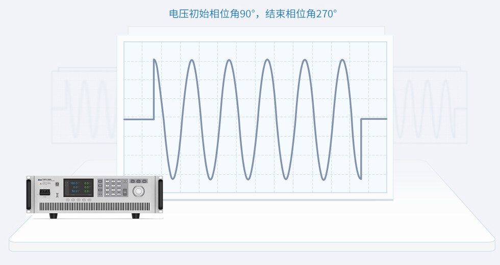高性能可編程交流電源可設(shè)定輸出電壓初始相位與結(jié)束相位角,常規(guī)應(yīng)用是將初始相位設(shè)置為90度,驗(yàn)證電子設(shè)備開機(jī)最大啟動峰值電流和浪涌電流,關(guān)斷后電壓下降至安全電壓的時間。