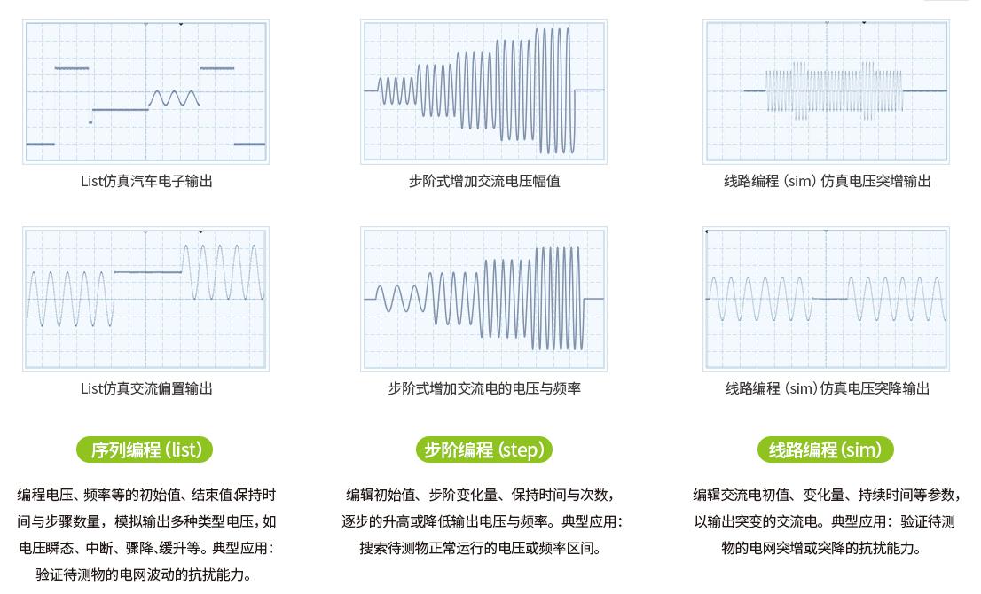 高性能可編程交流電源集成List、 Step、sim( 線路) 仿真等功能,可模擬電壓突升突降、中斷等多種類型電網(wǎng)電壓波動輸出,為電子產(chǎn)品性能和功能的驗(yàn)證提供多種類型的電源輸入,以驗(yàn)證待測物對電網(wǎng)波動的抗擾能力。對于不復(fù)雜編輯的電壓,可以將波形文件導(dǎo)入交流電源,交流電源能完整還原輸出,尤其適合于戶外光伏逆變器,通訊UPS等產(chǎn)品。