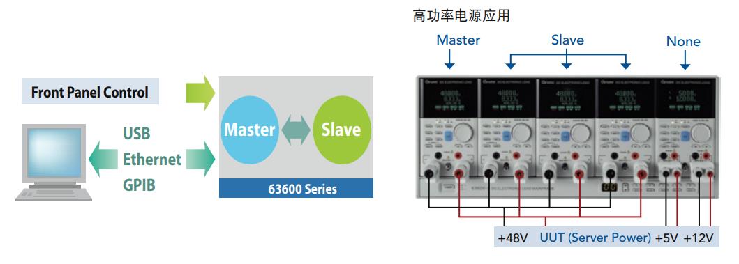 63600具有智能型主/從控制模式,當(dāng)負(fù)載功率需求增加時(shí),可透過并聯(lián)的方式(主/從控制)來達(dá)到所需的電流及功率。當(dāng)設(shè)定成主/從控制模式時(shí),所有設(shè)定成主/從控制的模塊形同一個(gè)單一負(fù)載,用戶僅需在主模塊上編程負(fù)載電流,主模塊經(jīng)過計(jì)算后會(huì)自動(dòng)將電流分配至其他模塊,如此可大大簡化使用者的操作步驟。63600同時(shí)備有USB標(biāo)準(zhǔn)界面、GPIB選配接口及Ethernet選配接口,用戶可透過這些接口進(jìn)行遠(yuǎn)程控制及其他的自動(dòng)測試應(yīng)用。