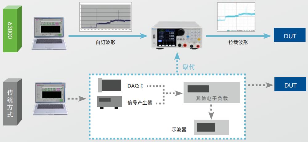 傳統(tǒng)拉載任意電流波形的方式需經(jīng)由DAQ卡或任意波形產(chǎn)生器將電流波形送給電子負載進行拉載;新增的使用者自訂波形方式是將電流波形儲存在內(nèi)建的快閃記憶體(Flash),可儲存10組電流波形,最高可達150萬個波形點數(shù),拉載實際電流的同時,亦提供拉載過程中所發(fā)生最大峰值電壓的正負值,大大節(jié)省以示波器確認電壓峰值的時間。