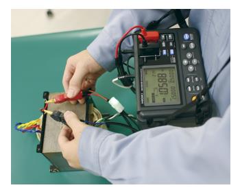 便于進(jìn)行現(xiàn)場(chǎng)維護(hù)保養(yǎng)工作的便攜式設(shè)計(jì)??梢允褂酶郊炖K將測(cè)試主機(jī)掛在脖子上,雙手拿住夾型測(cè)試線進(jìn)行測(cè)量。8節(jié)5號(hào)干電池供電,測(cè)量時(shí)間約10小時(shí)。(根據(jù)測(cè)量條件不同,使用時(shí)間會(huì)不同)