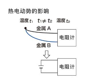 熱電動(dòng)勢(shì)是指不同金屬的連接部分所產(chǎn)生的電位差(如圖)。具體來(lái)說(shuō)會(huì)在測(cè)試探頭和被測(cè)物接觸的部分,測(cè)量?jī)x器和測(cè)量線的連接部分產(chǎn)生。熱電動(dòng)勢(shì)的大小根據(jù)測(cè)量環(huán)境的溫度不同而不同,溫差越大則熱電動(dòng)勢(shì)越大。RM3548的正負(fù)雙向流過測(cè)試電流,使用各自的檢測(cè)電壓,具備消除熱電動(dòng)勢(shì)影響的偏置電壓校正功能。