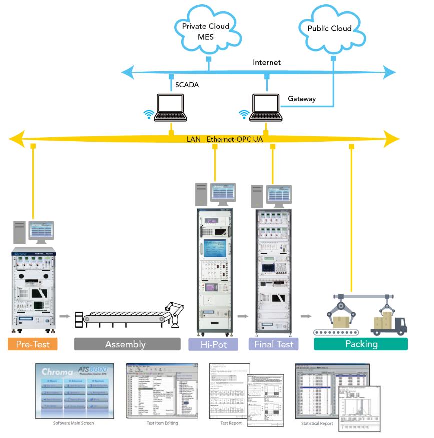 Chroma8000自動(dòng)測(cè)試系統(tǒng)適合現(xiàn)代化的大規(guī)模量產(chǎn)生產(chǎn)線,可搭配支援Chroma Sajet制造資訊系統(tǒng)(Manufacturing Execution System,MES)進(jìn)行測(cè)試站別、人員、產(chǎn)品序號(hào)及測(cè)試程式的控制與管理,以及測(cè)試數(shù)據(jù)上傳中央服器功能,達(dá)到測(cè)試程式集中管理與數(shù)據(jù)資料搜集/報(bào)表分析等應(yīng)用,協(xié)助客戶完成智能工廠之目標(biāo),提高產(chǎn)品品質(zhì)、效能,降低生產(chǎn)成本,創(chuàng)造企業(yè)利益最大化。另Chroma可提供客制化Shop-Floor控制系統(tǒng)服務(wù),連結(jié)客戶廠內(nèi)既有MES,到目前為止已協(xié)助眾多海內(nèi)外世界級(jí)制造大廠完成MES系統(tǒng)整合之實(shí)績(jī)案例。