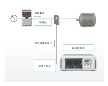 將電流傳感器連接到測(cè)量對(duì)象的配線(xiàn)上。減輕了配線(xiàn)和 測(cè)量?jī)x器損耗的影響,能夠在最接近實(shí)際工作環(huán)境的接 線(xiàn)狀態(tài)下測(cè)量高效率系統(tǒng)。