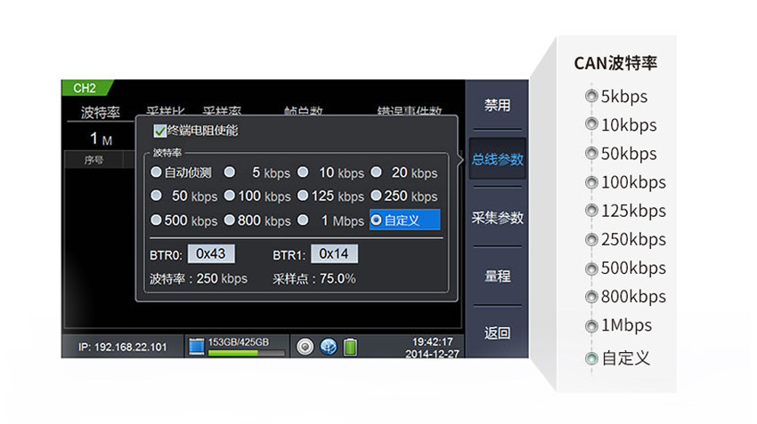 八個通道可以同時記錄報文,其中兩個通道可記錄波形。