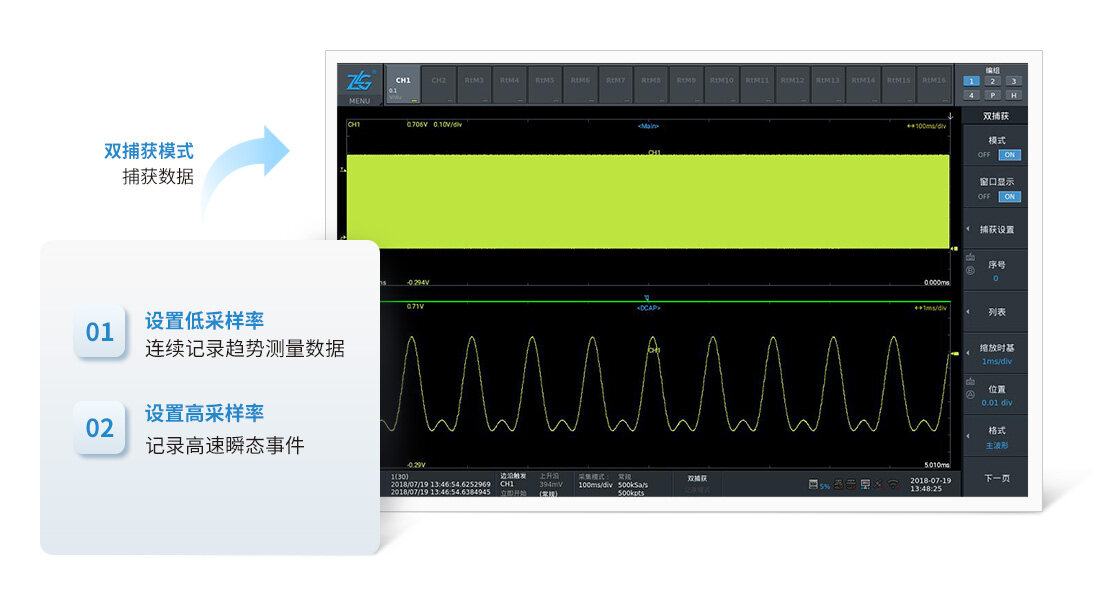 通過雙捕獲功能,可以同時(shí)設(shè)置兩個(gè)不同的采樣率來滿足數(shù)據(jù)捕獲要求。在波形處于正常狀態(tài)時(shí),保持低采樣率記錄波形變化趨勢(shì),一旦波形滿足觸發(fā)條件,示波記錄儀將立即切換到最高100MS/s的速度記錄高速瞬態(tài)事件。