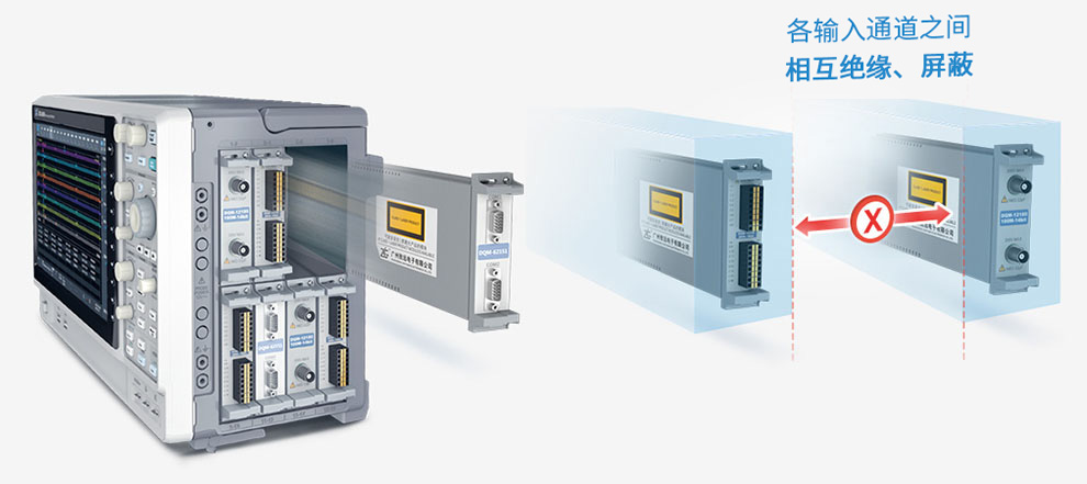 每臺(tái)示波記錄儀標(biāo)配8個(gè)板卡卡槽,各輸入通道之間相互絕緣隔離,盡可能地確保在強(qiáng)干擾、多參考電壓等復(fù)雜環(huán)境下的精確測(cè)試。