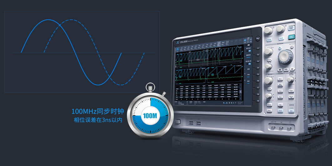 示波記錄儀內(nèi)部設(shè)有高穩(wěn)定性溫度補(bǔ)償?shù)?/span>100MHz同步時(shí)鐘,避免了溫度帶來時(shí)鐘漂移所引入的測(cè)量誤差。同時(shí)也保證了每一個(gè)通道ADC的采樣相位同步,減少了測(cè)量時(shí)通道間相位角所引入的誤差,誤差在3ns以內(nèi),保證所有通道信號(hào)同步測(cè)量。