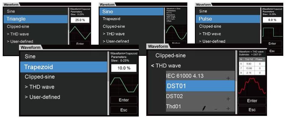 除了基礎(chǔ)正弦波,IT7900系列提供多種內(nèi)置的交流波形,例如三角波,鋸齒波,方波,梯形波和削幅波。用戶可通過菜單調(diào)用并在LCD屏幕上顯示出選擇的波形。結(jié)合設(shè)備的序列編程功能,可組合不同波形的連續(xù)輸出,以應(yīng)對復(fù)雜的電力電子擾動(dòng)測試。