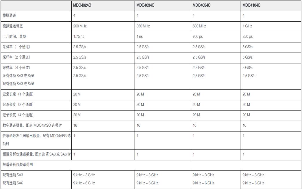 MDO4000C系列示波器選型參數表
