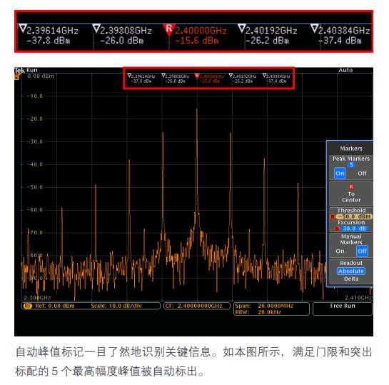 在傳統(tǒng)的頻譜分析儀中,為了標識所有關心 的峰值而打開和放置足夠的標記可能會非常費事 。 MDO4000C 系列自動把標記放在峰值上,指明每個峰值的頻 率和幅度,提高了這個過程的效率。用戶可以調節(jié)用來確定什 么是峰值的標配。 最高幅度峰值稱為參考標記,顯示為紅色。標記讀數可以在絕 對值和增量讀數之間切換。在選擇 Delta 時,標記讀數顯示每 個峰值距參考標記的相對頻率和相對幅度。 同時還提供兩個手動標記,用于測量頻譜的非峰值部分。啟用 后,參考標記即附加在其中一個手動標記上,允許在頻譜中的 任何位置進行增量測量。除了頻率和幅度以外,手動標記讀數 包括噪聲密度和相噪讀數,具體取決于選擇的是絕對值還是增 量讀數?!暗街行牡膮⒖紭擞?(Reference Marker to Center)” 功能可以立即把參考標記所指示的頻率移動到中心頻率。