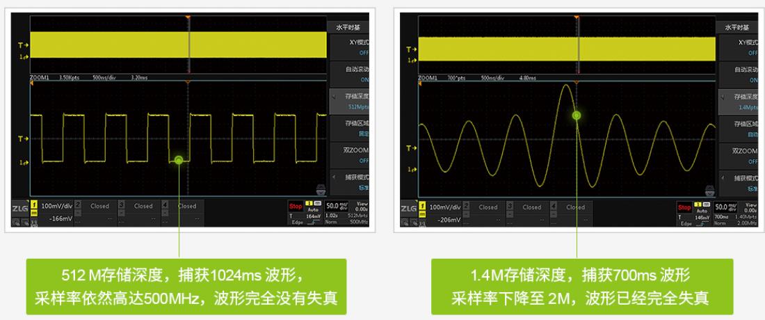 存儲深度=采樣率×采樣時間;如果存儲深度不足,高采樣率的情況下只能捕獲一小段波形,ZDS5054D標配512Mpts超大存儲深度,捕獲1024ms波形的情況下,依然可以保持100MSa/s采樣率。