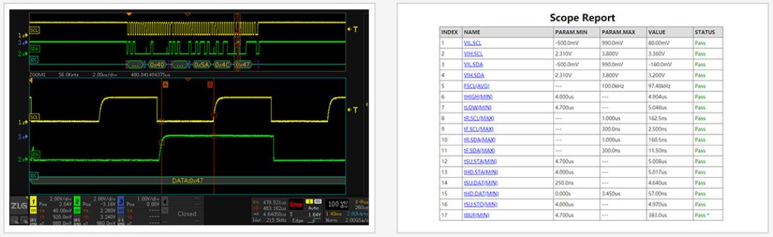 手機、智能穿戴、家電、智慧屏、多媒體影音等嵌入式智能設備,對于內(nèi)部總線通信時序一致性有嚴格要求。ZDS5054D創(chuàng)新的時序分析功能,可分析IIC、IIS、SPI、MIPI-RFFE等信號的脈寬、幅值、邊沿、建立時間、保持時間等多種組合參數(shù),原本手動測試需要幾十分鐘,使用時序分析功能自動測試僅需一秒鐘即可完成,并可導出測試報告。