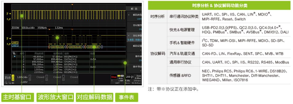 ZDS5054Pro、ZD5054D顛覆性地標配45種串行通信協(xié)議解碼,涵蓋常用的現(xiàn)場總線、系統(tǒng)總線以及內(nèi)部總線。3秒鐘即可完成512Mpts波形解碼,協(xié)助工程師快速完成通信調(diào)試。
