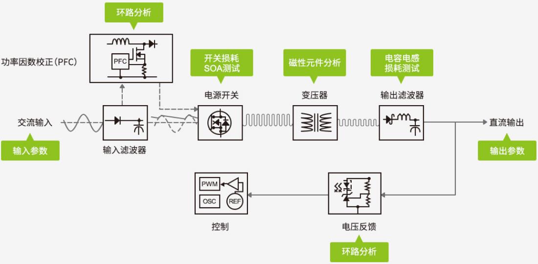 ZDS5054A電源分析功能涵蓋了輸入輸出特性測試,MOSFET、磁性元件、電容、電感等器件分析,調(diào)制波形測試等功能,全方位評測電源可靠性。