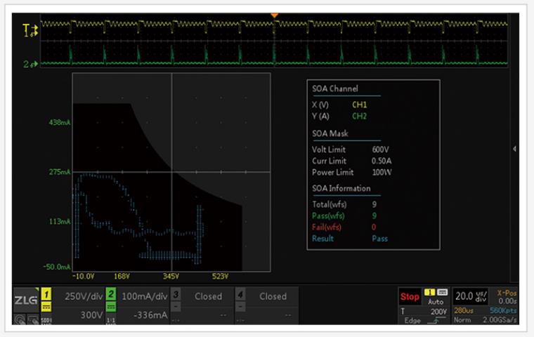 功率MOSFET瞬時電壓、電流、功率超出安全工作區(qū),會導致器件損壞、爆炸的風險陡增,常規(guī)調(diào)試手段難以對器件的各種工況進行全面評估。SOA 安全工作區(qū)分析功能,可統(tǒng)計MOSFET在所有工況下瞬時參數(shù)超出安全工作區(qū)的概率,便于工程師更好的評估電源工作穩(wěn)定性。