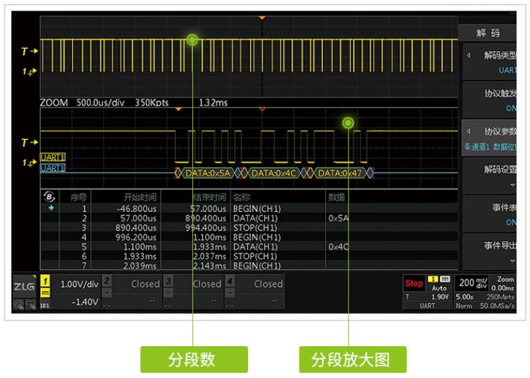 對于偶發(fā)信號的波形統(tǒng)計分析,過去需要工程師蹲守在示波器前進行手動測試。分段存儲功能可對觸發(fā)的特定波形進行存儲、回放,波形幀數(shù)最高可達52萬幀,徹底解放工程師的工作。