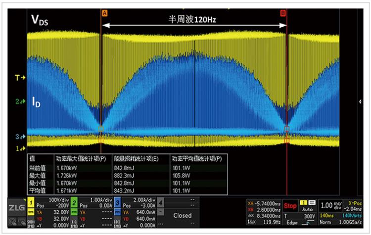 功率MOSFET開關(guān)損耗測試是PFC電源調(diào)試中的難點,由于SPWM每個周期的開關(guān)損耗都不相同,傳統(tǒng)通過手光標和數(shù)學運算手動測試的方式已經(jīng)不適用。ZDS5054A示波器標配512Mpts存儲深度,可捕獲多個完整調(diào)制周期SPWM波形,自動統(tǒng)計各開關(guān)周期的開通/關(guān)斷/導通損耗,計算最大值、最小值、平均值,準確量化開關(guān)器件的功率損耗。