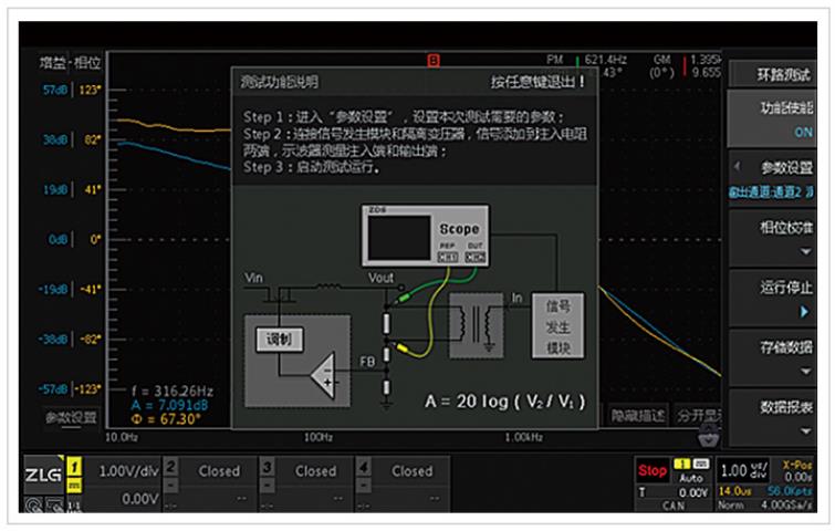 內(nèi)置函數(shù)信號發(fā)生器,支持正弦波、三角波、方波、鋸齒波等標準函數(shù)信號輸出,頻率高達30MHz,可以自動掃描電源控制環(huán)路伯德圖,自動顯示相位裕度和增益裕度等參數(shù),幫助工程師快速進行環(huán)路分析,加快調(diào)試效率。