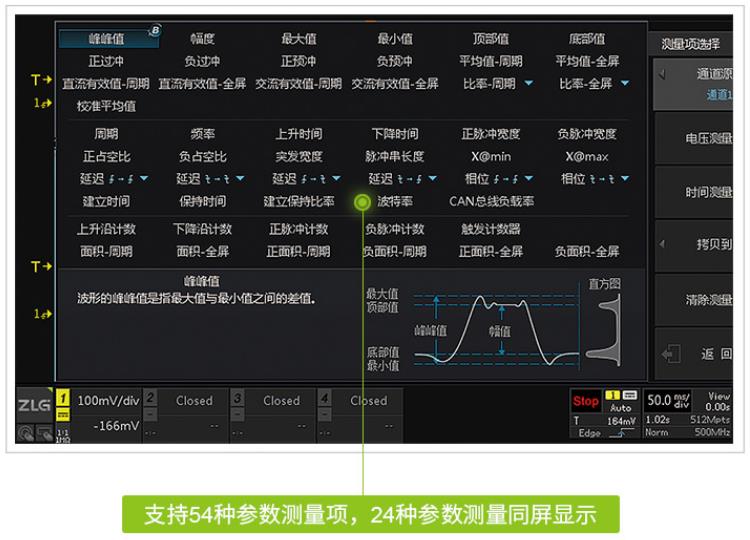參數(shù)測量,快速判斷異常;支持54種參數(shù)的全屏測量統(tǒng)計,通過FPGA并行計算全部波形的最大值,最小值,平均值,標準差,最多可同時顯示24種參數(shù),計算全程僅需1秒鐘。
