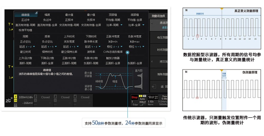 ZDS4000系列示波器通過FPGA全硬件并行處理,對每一幀波形每一周期進行測量統(tǒng)計,測試項目可達51種,并且支持24種參數(shù)同時顯示。