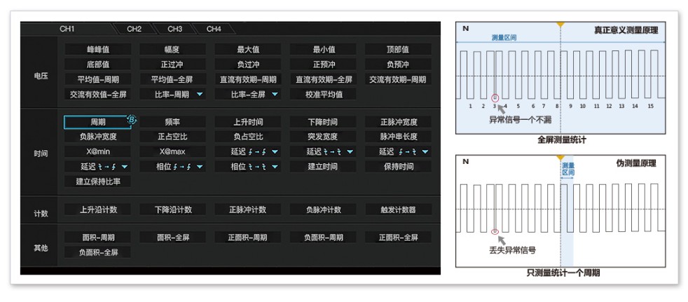 ZDS1104支持每一幀波形的每一個(gè)周期進(jìn)行測(cè)量統(tǒng)計(jì),在最大采樣率和最大存儲(chǔ)深度下,可以測(cè)量到足夠多的數(shù)據(jù),讓異常信號(hào)無(wú)所遁形。