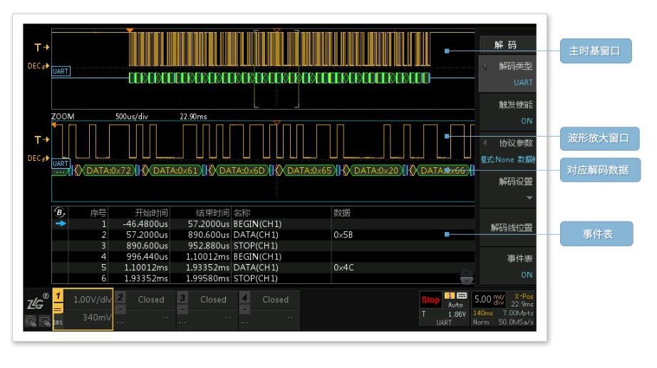 ZDS1104免費(fèi)標(biāo)配17種串行協(xié)議解碼,配合ZOOM功能,可以采集多幀的波形,并對(duì)照解碼數(shù)據(jù)逐一進(jìn)行分析。