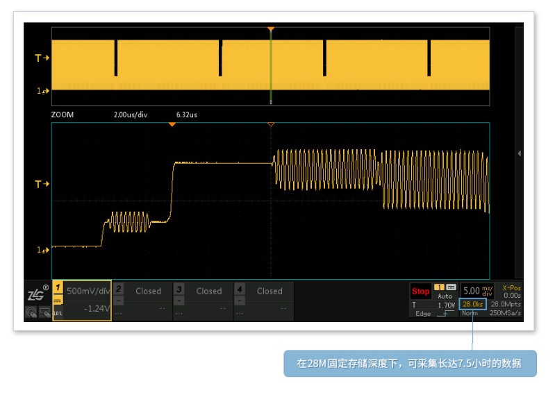 采樣時(shí)間等于存儲(chǔ)深度除以采樣率,28M的存儲(chǔ)深度有效地保證了采樣率的充分發(fā)揮,即使長(zhǎng)時(shí)間觀察信號(hào),波形也不會(huì)因?yàn)椴蓸勇氏陆刀д妗?/p>