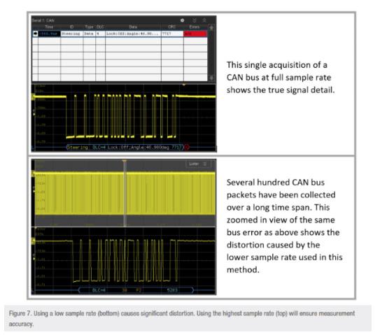 當(dāng)捕獲脈沖或分組信息(如串行總線)時(shí),在許多情況下,必須捕獲數(shù)百次這些數(shù)據(jù)包。在大多數(shù)示波器上,包括Tektronix 3系列,唯一的方法是縮小你的信號(hào)(增加你的時(shí)間基數(shù))。然而,問(wèn)題是這恰好降低了你的采樣率。如此,當(dāng)你試圖分析每個(gè)數(shù)據(jù)包時(shí),你得到的捕獲都是扭曲的而且毫無(wú)用處。