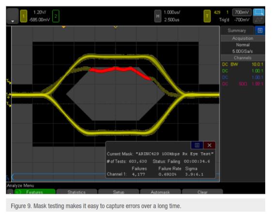 模板(掩碼)極限測(cè)試在驗(yàn)證測(cè)試中非常有用,無(wú)論是在研發(fā)還是制造中。掩碼測(cè)試功能非常簡(jiǎn)單地圍繞信號(hào)創(chuàng)建掩碼。如果信號(hào)中有錯(cuò)誤,則會(huì)違反掩碼,并使用紅色標(biāo)記錯(cuò)誤和通過(guò)/失敗統(tǒng)計(jì)數(shù)據(jù),如圖所示。這是執(zhí)行通過(guò)/失敗測(cè)試并確定信號(hào)在很長(zhǎng)一段時(shí)間內(nèi)是否經(jīng)歷錯(cuò)誤的最有效方法。