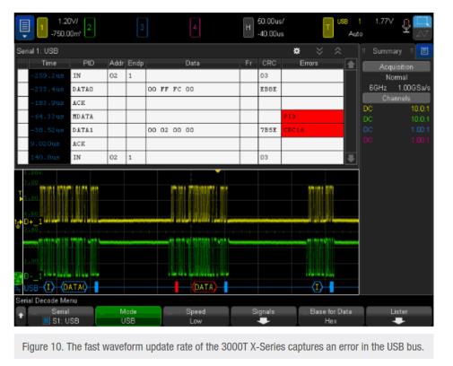 Keysight的InfiniiVision系列儀器是目前唯一使用基于硬件串行解碼的示波器。所有其他示波器供應(yīng)商都使用軟件后處理技術(shù)來(lái)解碼串行數(shù)據(jù)包/幀,使用這些軟件技術(shù),波形和解碼刷新速度非常慢,有時(shí)會(huì)慢到每秒刷新幾次。當(dāng)你必須同時(shí)分析多個(gè)串行總線時(shí),情況只會(huì)變得更糟。需要注意的是:快速的波形刷新速度增加了捕獲不頻繁串行通信的概率。
