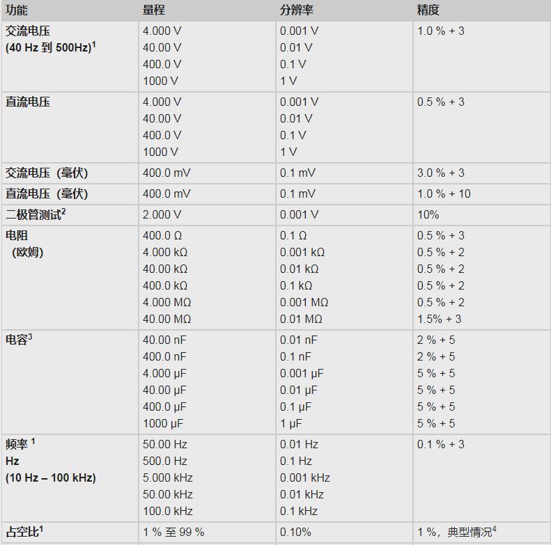 校準后可保持<span font-size:14px;background-color:#ffffff;"=""> 1 年的精度,工作溫度為 18 °C 到 28 °C,相對濕度為 0 % 到 75 %。精度規(guī)格形式如下: ±(讀數(shù) % + 最低有效位數(shù))。
